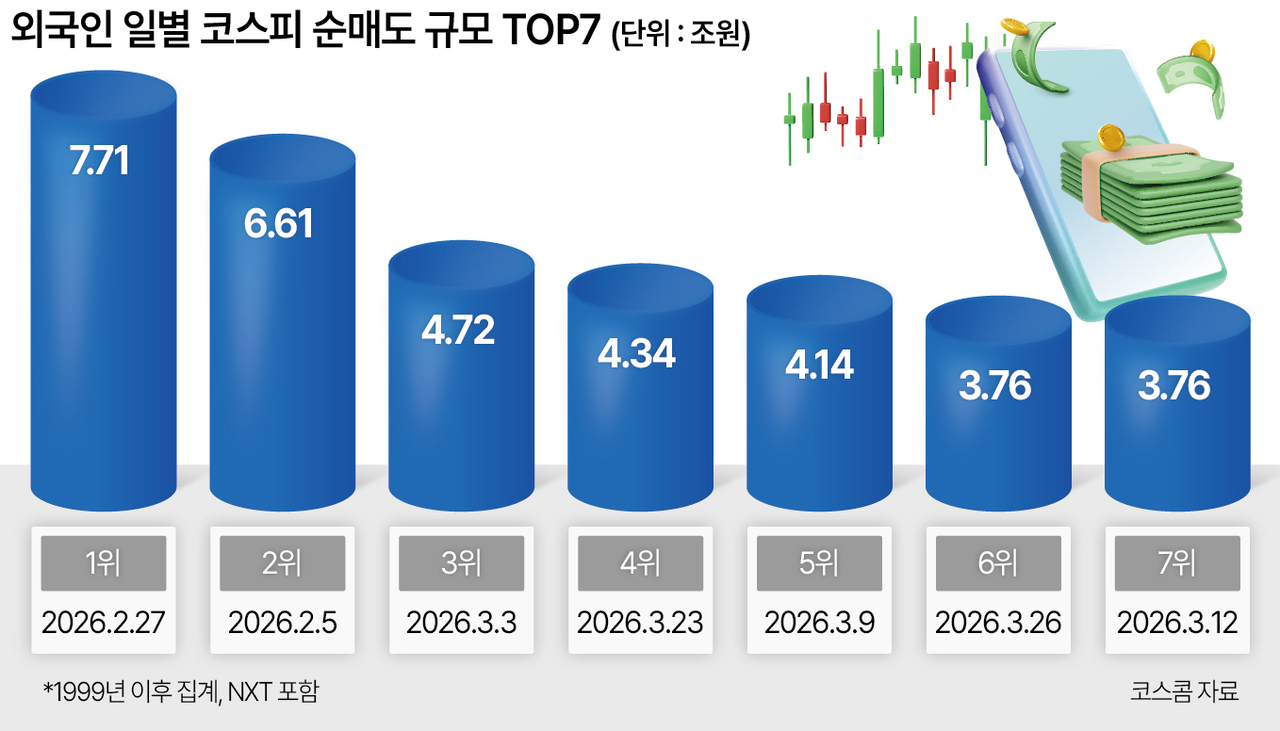 27일 코스콤에 따르면 전날 외국인은 유가증권시장(KRX, NXT 합산) 약 3조7000억원 규모 순매도를 기록했다. 이는 1999년 이후 기준 단일일 순매도 규모 6위 수준이다. 같은 기준으로 외국인 일별 순매도 상위 7건 가운데 5건이 이달에 집중됐다. 최근 6거래일 연속 1조원 이상 순매도가 이어졌고, 이번 주에만 10조원을 웃도는 자금이 빠져나갔다.