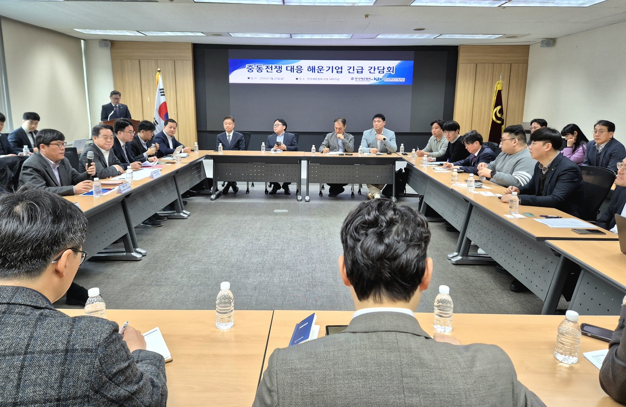 | 한국해양진흥공사는 27일 해양수산부, 한국해운협회와 서울 여의도 한국해운협회에서 ‘중동전쟁 대응 해운기업 긴급 간담회’를 개최했다.[한국해양진흥공사 제공] |