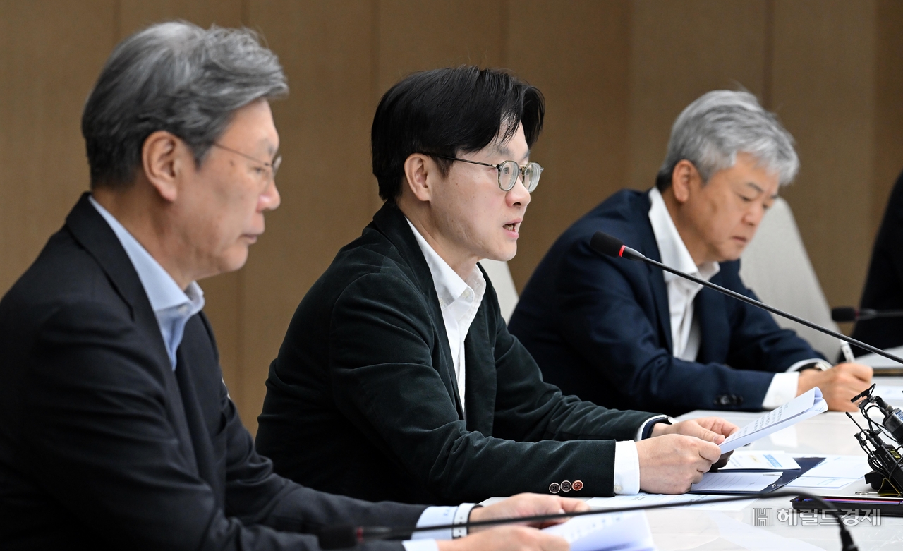 [헤럴드pic] 모드발언하는 김정관 산업통상부 장관 글꼴 선택 본문 텍스트 크게본문 텍스트 작게 인쇄 [헤럴드경제=이상섭 기자] 김정관 산업통상부 장관(가운데)이 27일 오전 서울 중구 대한상의에서 열린 중동전쟁 관련 경제단체 간담회에서 모두발언하고 있다.
