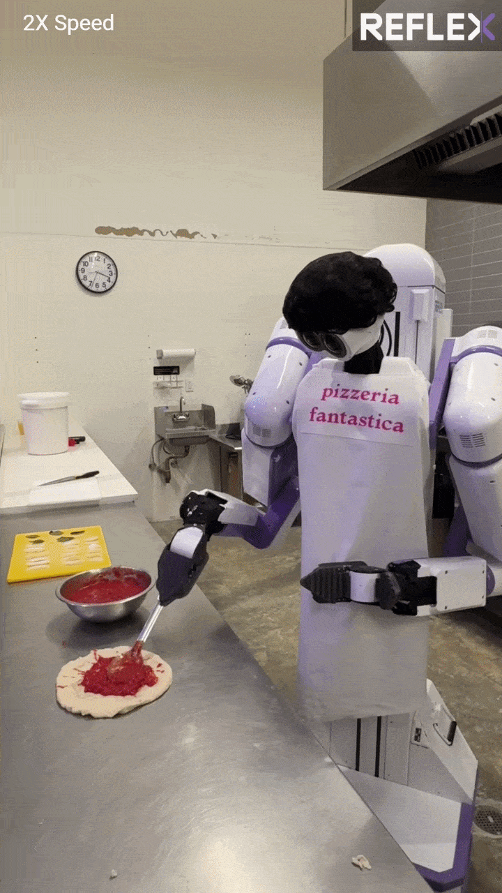 2배속으로 재생된 영상에서 리플렉스 로봇은 피자 도우(빵) 위에 토마토 소스를 올려 넓게 펼쳐 바른 후 피자치즈와 바질 잎을 올렸다.