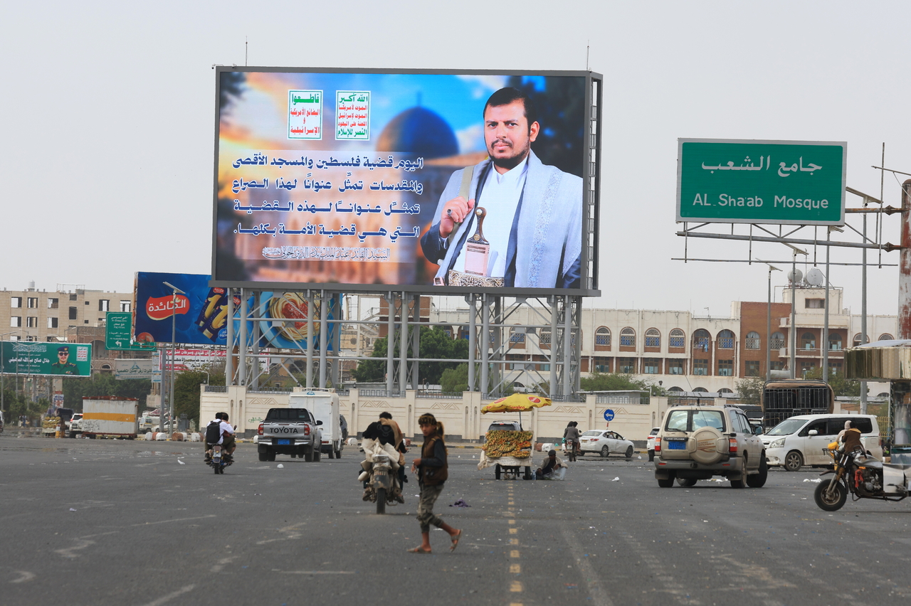 | 예멘 한 도시의 거리에 후티 반군 지도자를 부각시키는 광고판이 설치돼 있다. [EPA] |