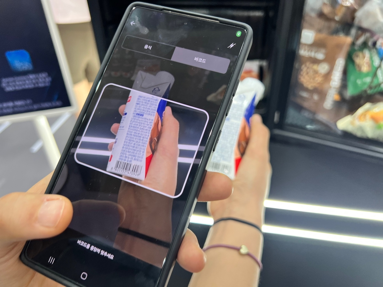 | 가민 커넥트 플러스 존에서 현장 관계자의 안내에 따라 스마트폰을 들고 단백질 음료의 바코드를 촬영하는 모습. [박혜림 기자/rim@] |