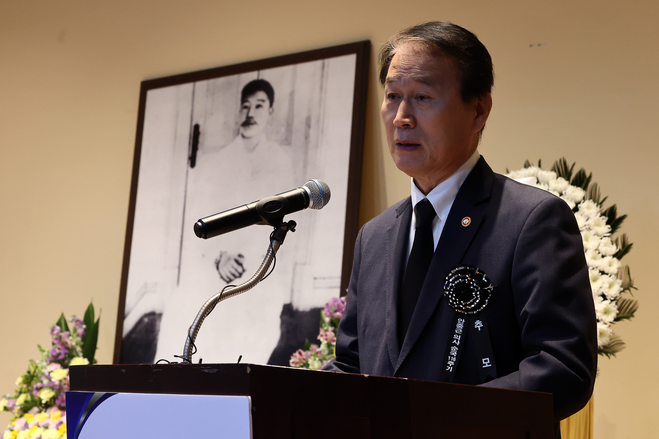 | 권오을 국가보훈부 장관이 26일 서울 중구 안중근의사기념관에서 열린 안중근의사 순국 116주기 추모식에서 추모사를 하고 있다. [연합] |