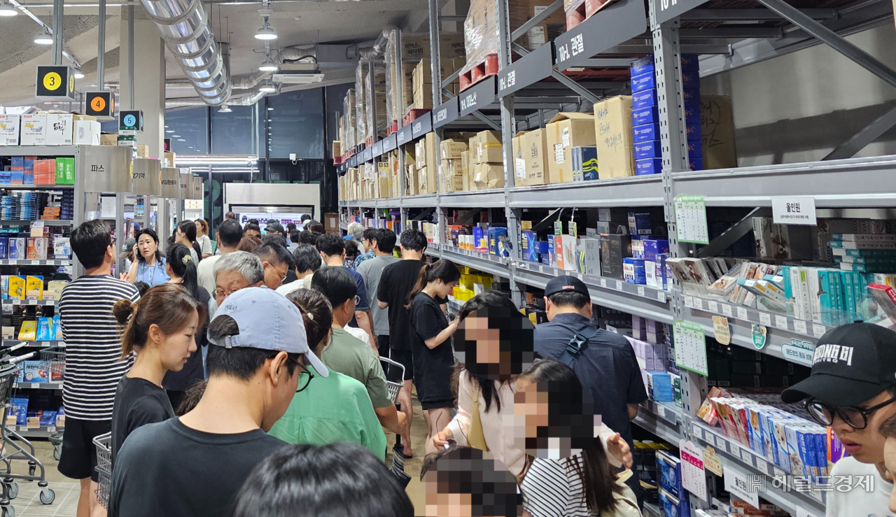 | 경기 성남시의 ‘창고형 약국’ 메가팩토리(MEGA PHACTORY)에서 고객들이 계산을 하기 위해 줄지어 있는 모습. 최은지 기자 |