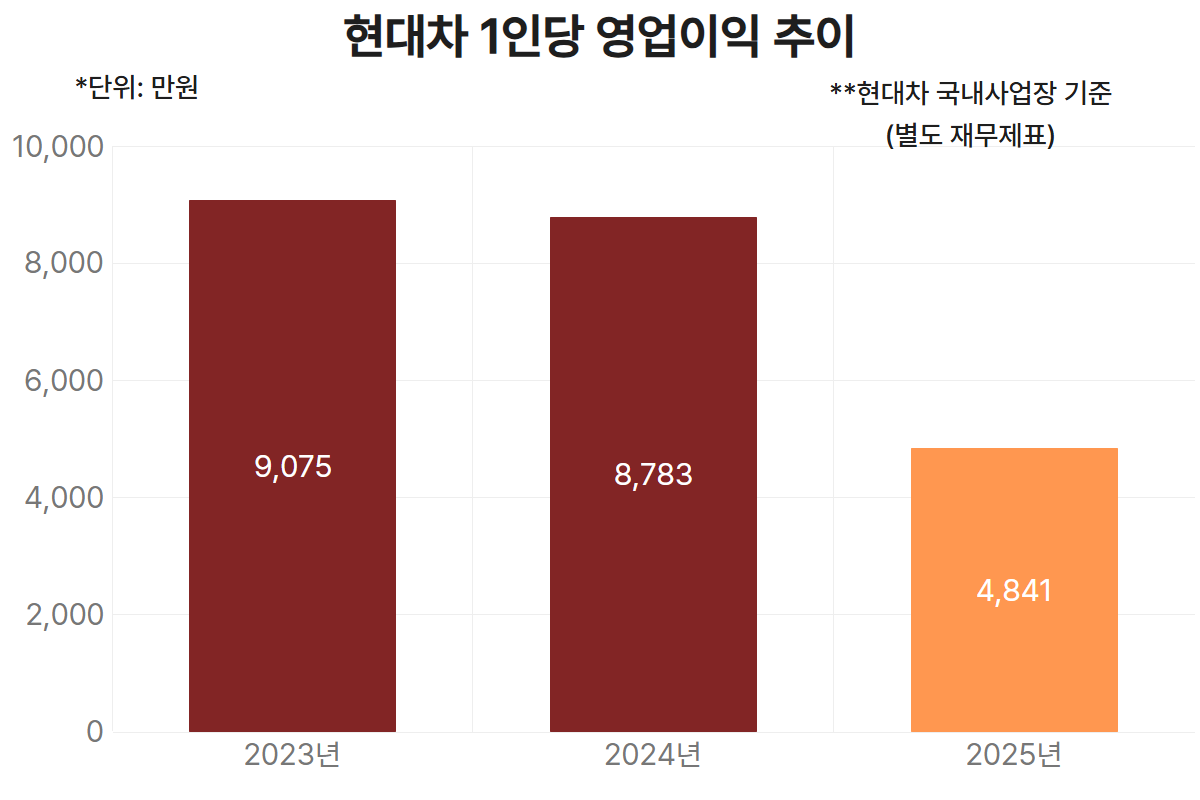28일 업계에 따르면 지난해 현대자동차의 별도 재무제표 기준 직원 1인당 영업이익은 4800만원으로 집계됐다. 이는 2023년(9100만원)과 2024년(8800만원) 수준에서 절반 수준이다.