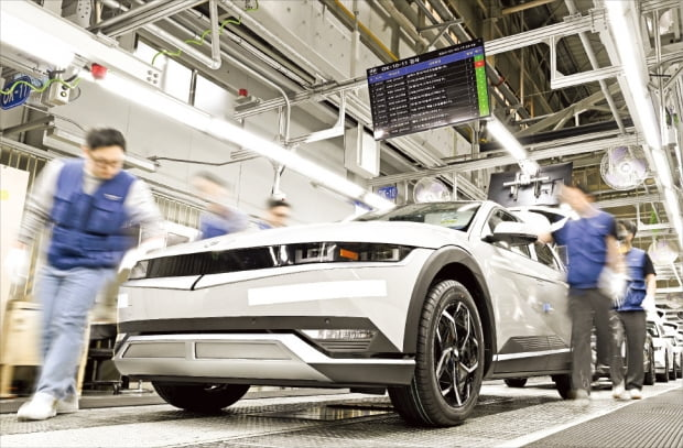 | 현대자동차의 울산 1공장에서 작업자들이 아이오닉 5의 품질을 점검하고 있다. [현대차그룹 제공] |