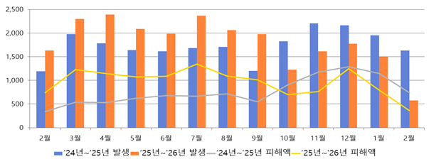 29일 경찰청에 따르면 통합대응단 출범 다음 달인 지난해 10월부터 올해 2월까지 발생한 보이스피싱 범죄 건수는 전년 동기 대비 31.6%(9777건→6687건), 피해액은 26.4%(5258억원→3870억원) 각각 줄었다. 특히 올해 2월 발생 건수는 전년도 같은 달보다 64.5% 감소하며 뚜렷한 하락세를 보였다.