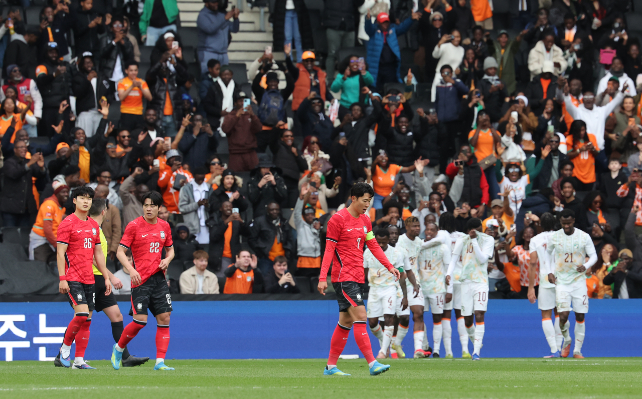 | 한국축구국가대표팀이 28일(현지시간) 영국 밀턴킨스 스타디움 MK에서 열린 코트디부아르와 평가전에서 세번째 실점을 아쉬워하고 있다. 뒤쪽으로 코트디부아르 선수와 팬들이 기뻐하고 있다. [연합] |
