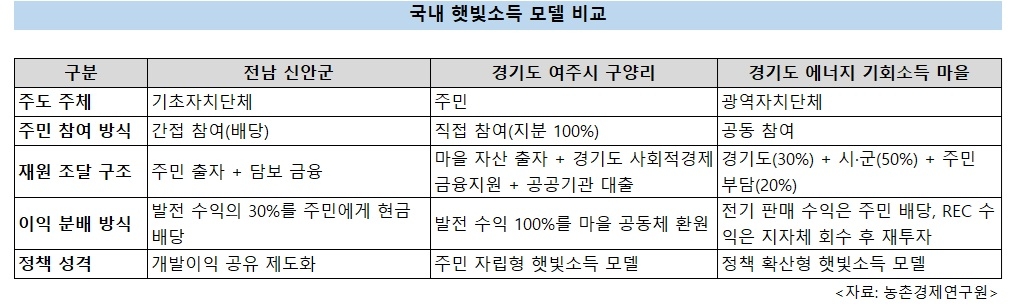 특히 주민이 단순한 수혜자를 넘어 발전 사업의 소유와 수익 창출의 주체로 참여하는 것이 핵심이다. 연구원에 따르면 국내외에서 운영 중인 성공적인 햇빛소득 모델은 세가지다.