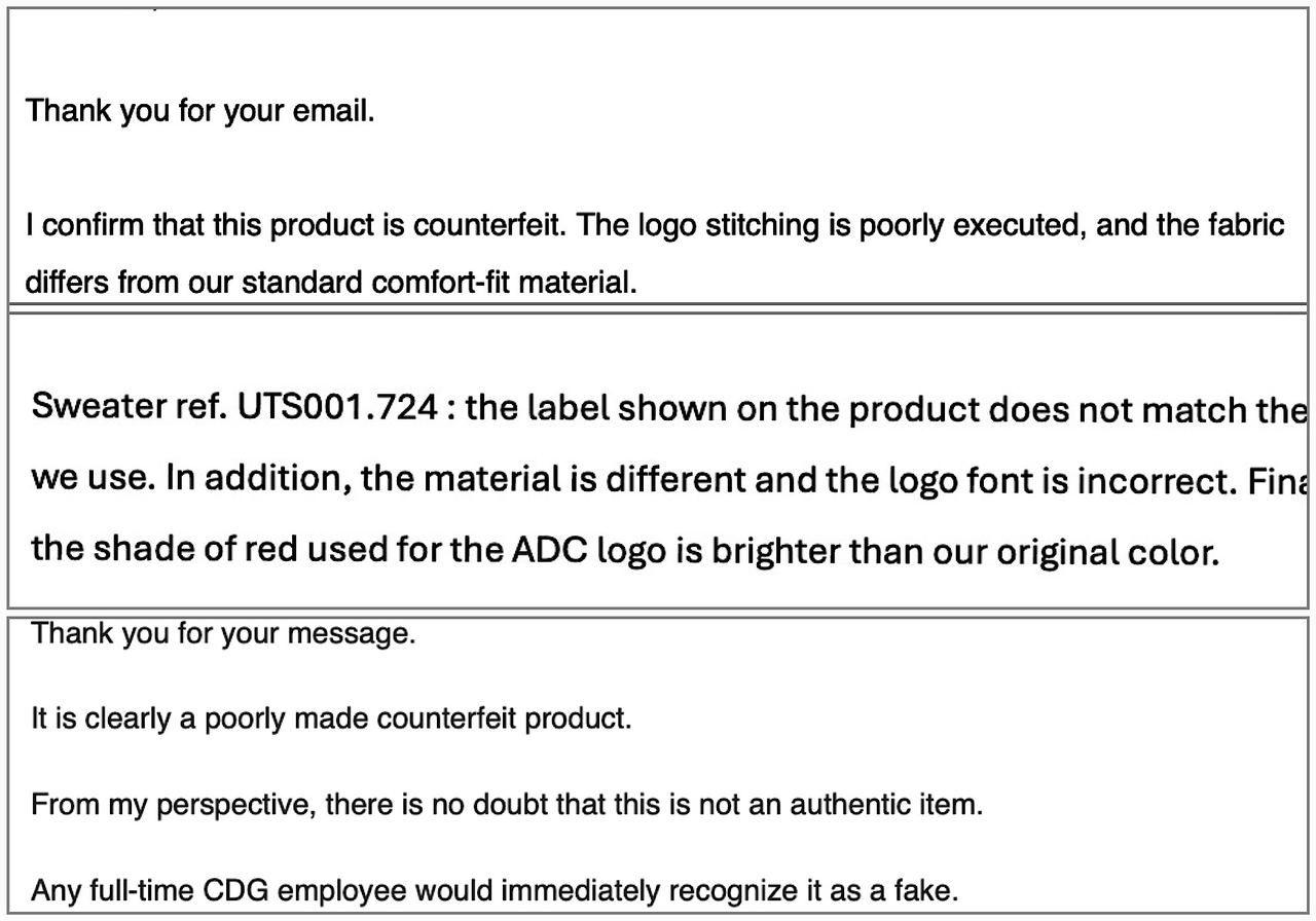 구매한 제품을 공식 수입사인 삼성물산을 통해 각 브랜드 본사에 보낸 뒤 정품 여부 확인을 의뢰했다. 1~2주 후 회신한 이메일에는 모두 가품으로 판정됐다는 내용이 담겼다. 메종키츠네 본사는 “본 제품이 가품임을 확인했다. 로고 자수 처리가 미흡하며, 원단 또한 당사 표준 소재와 차이가 있다”고 밝혔다. 아미와 꼼데가르송도 소재와 로고 등이 정품과 다르다고 확인해 줬다.