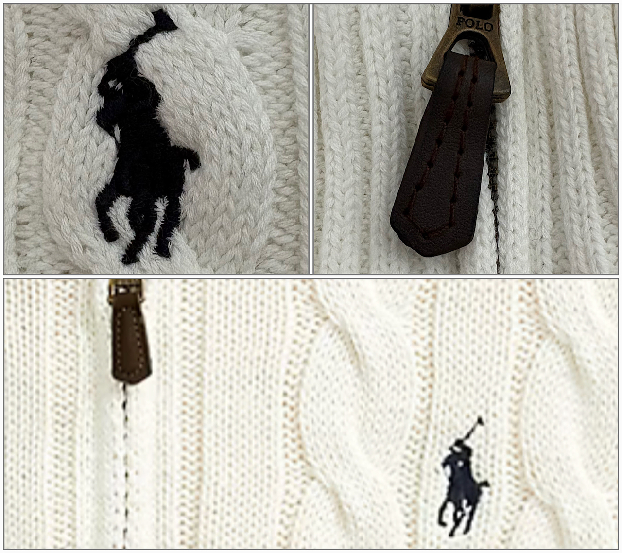 | 한 인플루언서가 진행한 공동구매를 통해 구매한 폴로 랄프로렌 스웨터의 로고·지퍼(위쪽)와 공식 사이트에서 판매되는 같은 제품 상세 이미지 [강승연 기자·폴로 랄프로렌 사이트 캡처] |