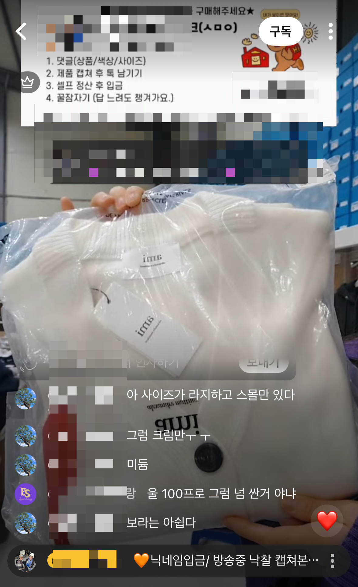 라방은 구매 방식도 유사했다. 라방을 보며 댓글로 구매할 상품과 색상, 사이즈를 남기고, 입금한 뒤 카카오톡으로 확인용 메시지를 보내면 된다. 이후 판매자는 라방에서 구매자가 구입한 제품을 확인하듯 보여주고, 카카오톡으로 예상 배송일자를 알려줬다. 방송 도중에 “사장님이 인심을 썼다”며 1만~2만원 추가 할인과 2차 구매를 유도하는 경우도 적잖았다.