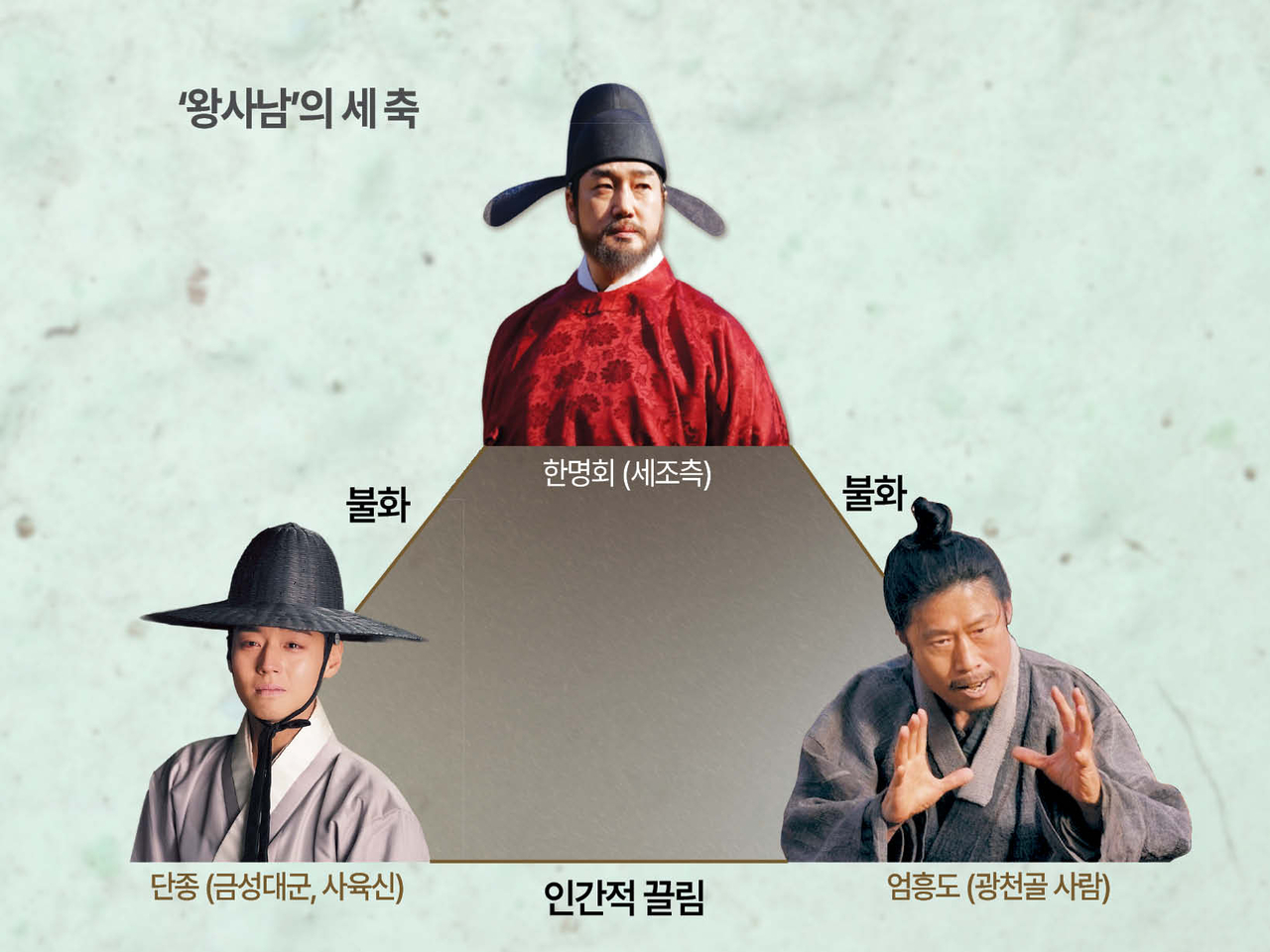 영화 스토리는 매우 단순하다. 압축하면 단종-엄흥도-한명회, 이 세 사람이 삼각형의 꼭지점을 형성하고 있다. 세조 세력은 한명회(유지태) 한 명이 메인 빌런이다. 한명회는 단종, 엄흥도와 불화한다. 단종과 엄흥도는 인간적으로 끌린다. 이게 끝이다.
