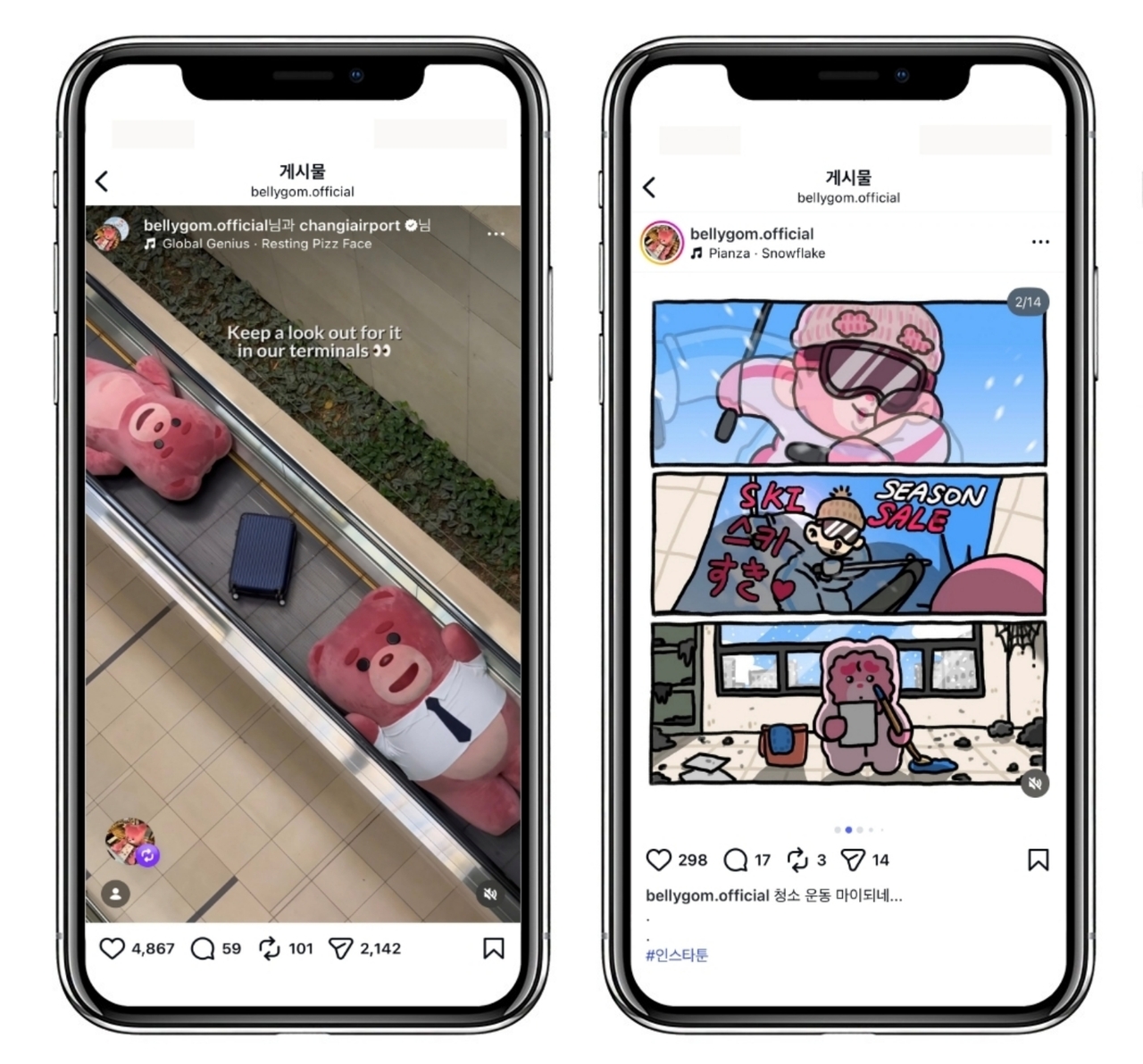 콘텐츠 영역도 넓히고 있다. 올해부터 매주 10컷 이내 인스타툰을 연재 중이다. ‘인간사회에 적응해 나가는 긍정적인 벨리곰’을 콘셉트로 공감형 스토리를 선보이고 있다. 구독자 반응에 따라 제작 편수를 늘리고 웹툰 전문기업과 협업, 애니메이션 확장도 추진한다. 숏폼 활동도 활발하다. 지난해 봄 공개한 ‘함부로 따라하면 큰일나는 벚꽃 사진 촬영법’은 1000만뷰를 기록했다.