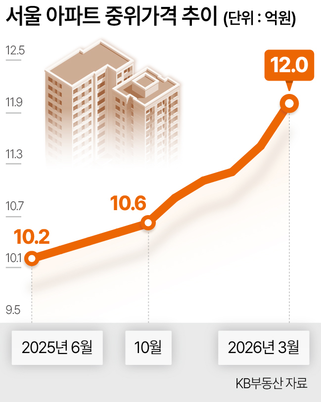 30일 KB부동산이 발표한 ‘3월 월간 주택가격 동향’에 따르면, 서울 아파트 중위 매매가격(16일 조사 기준)은 12억원으로 집계됐다. 전월 11억5000만원보다 4.35% 급등한 수치다. 작년 3월 9억9083만원과 비교하면 1년 만에 2억917만원이나 상승했다.
