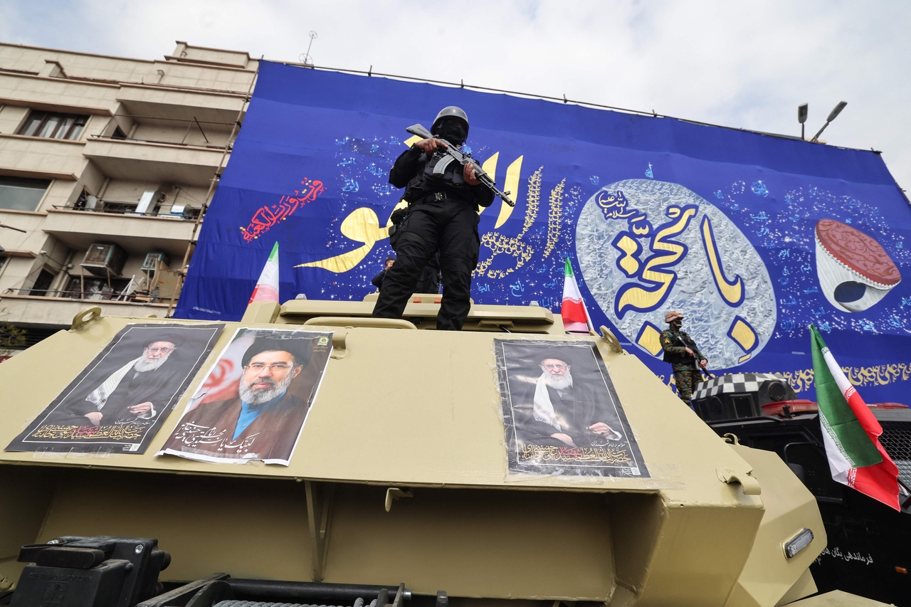 | 지난 11일(현지시간) 이란 수도 테헤란 엥겔랍 광장에서 이란혁명수비대(IRGC) 사령관, 육군 사령관 및 미국과 이스라엘의 이란 공습 초기 사망자들의 장례식이 거행되는 동안, 보안군 대원들이 피살된 이란 최고 지도자 아야톨라 알리 하메네이(왼쪽과 오른쪽)와 그의 아들이자 이란의 새 최고 지도자인 아야톨라 무즈타바 하메네이의 초상화가 부착된 장갑차 위에서 경비를 서고 있다. [AFP] |