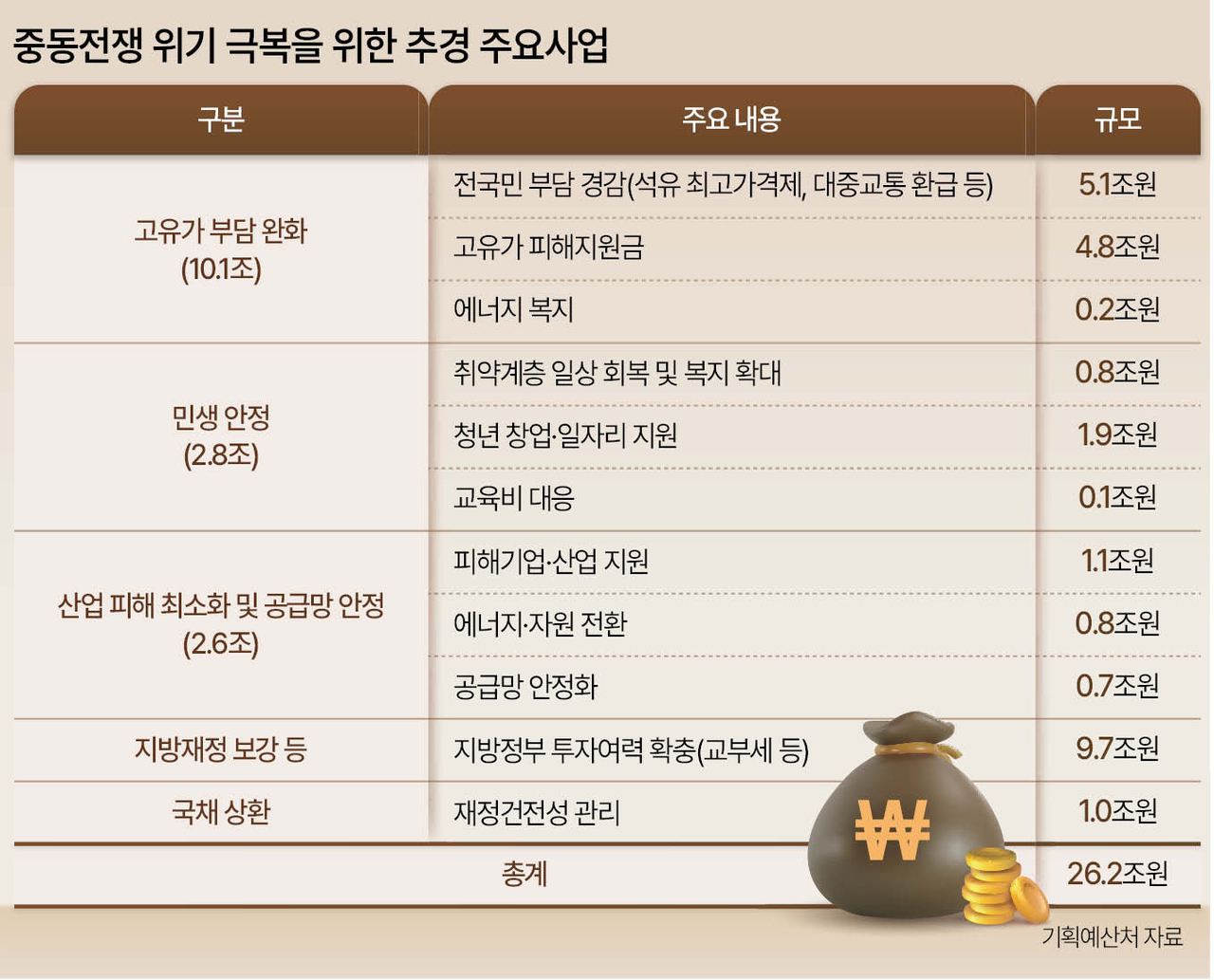 중동전쟁 장기화로 경제 전반의 불확실성이 커지자 정부가 26조2000억원 규모의 추가경정예산안을 편성했다. 유가 급등에 대응해 석유 최고가격제 재원을 보강하고 K-패스 환급률을 한시 상향하는 한편, 고유가·고물가로 부담이 커진 서민층에는 소득 하위 70%를 대상으로 1인당 10만~60만원의 현금성 지원을 병행하기로 했다. 소상공인·취약계층·청년 지원도 포함해 경기 부양보다 충격 완화에 초점을 맞춘 추경이라는 게 정부 설명이다.