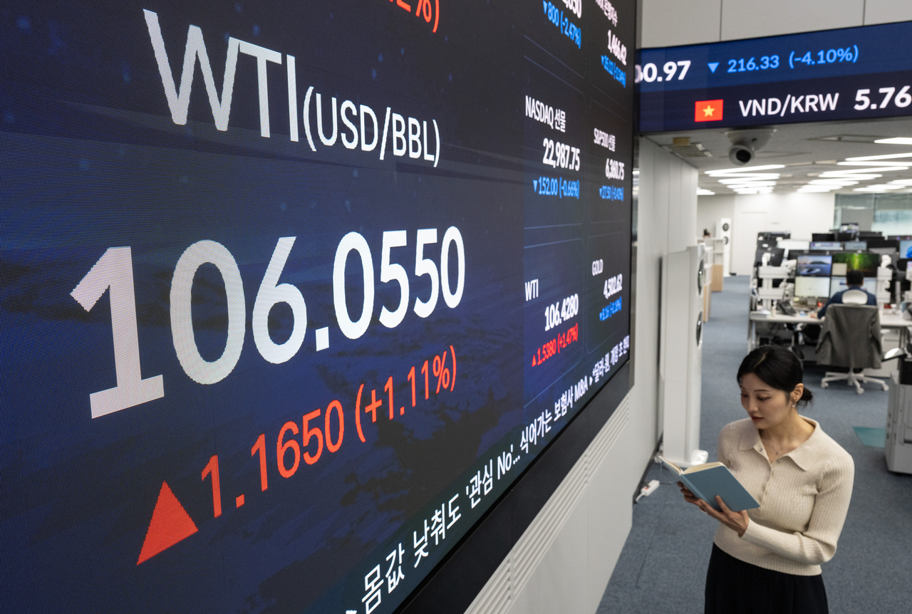 | 미국·이스라엘과 이란의 전쟁이 개전 31일째를 맞은 30일(현지시간) 국제 유가가 상승했다. 미국 서부텍사스산원유(WTI)는 종가 기준 2022년 이후 처음으로 배럴당 100달러선을 넘겼다. 31일 오전 서울 중구 우리은행 딜링룸 전광판에 WTI 가격이 표시돼 있다. 윤창빈 기자 |