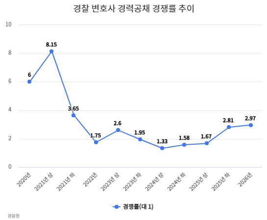 경찰 변호사 경력공채는 2023년 하반기부터 지난해 초까지 1명대 경쟁률을 보였다. 경찰청은 시들해진 인기를 다시 살려보겠다고 약간의 유인책을 마련했다. 변호사 경채로 뽑히면 5년 동안은 반드시 일선 경찰서의 수사팀(경제팀·통합수사팀)에 배치돼 쏟아지는 사건과 씨름해야 했는데 2024년부터는 1년만 경찰서 직접 수사 부서에서 지내면 나머지 4년은 경찰청이나 시도경찰청에서도 근무할 수 있게 됐다. 다만 이런 조치에도 뚝 떨어진 경쟁률은 반등하지 않았다.