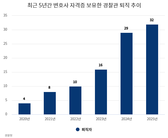 경찰청 자료를 보면 변호사 자격증을 보유한 경찰 가운데 조직을 떠난 이들은 2020년 4명이었으나 지난해엔 32명으로 크게 늘었다. 중대형 로펌은 형사 사건의 무게중심이 경찰로 옮겨가면서 경찰의 수사문법을 잘 아는 이른바 ‘전관 경찰’ 변호사를 영입하려 들고 있다.