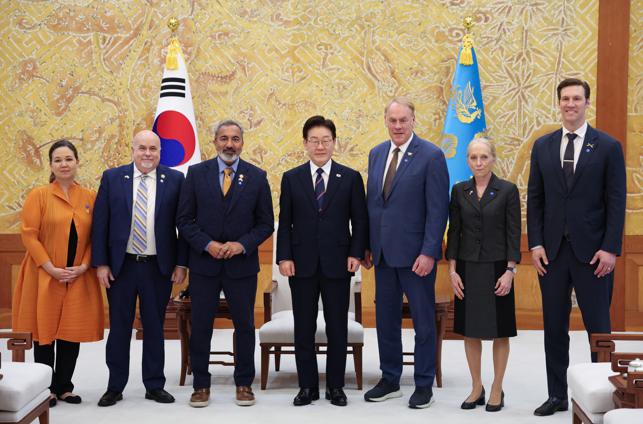 | 이재명 대통령이 31일 청와대에서 미국 하원의원단 접견에 앞서 기념 촬영을 하고 있다.[연합] |
