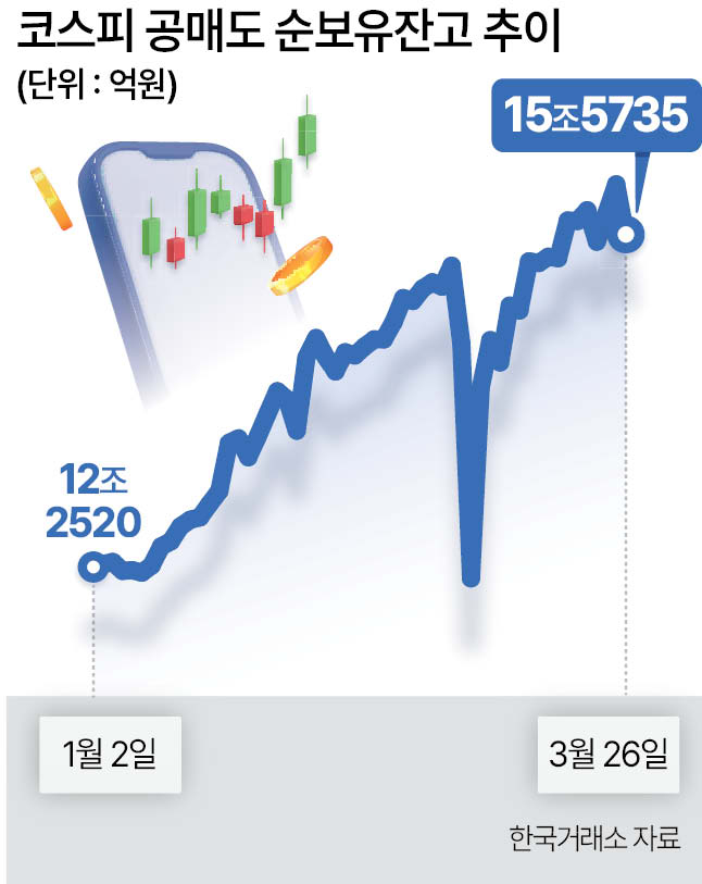 31일은 국내 증시에서 공매도가 재개된 지 정확히 1년째 되는 날이다. 지난해 말부터 주가가 급등하면서 공매도 규모는 크게 감소했지만, 최근 이란 전쟁 발발 이후로 분위기는 급반전됐다. 3월 들어 하루 평균 공매도 거래대금은 전월 대비 40% 이상 급증했고, 공매도 규모도 사상 최초로 16조원을 돌파했다. 추가적으로 주가 하락을 전망하는 투자심리가 늘고 있는 것으로 풀이된다.