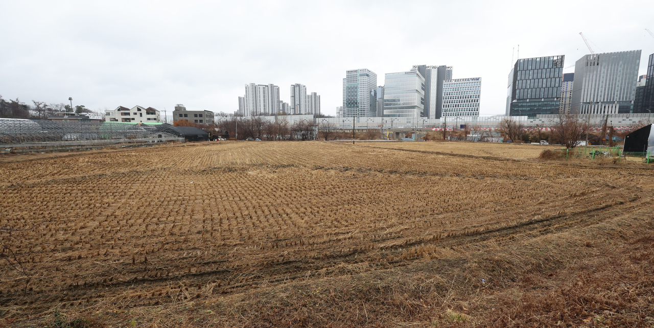 | 정부가 전국 농지 소유자를 대상으로 처음으로 전수조사를 벌이는 방안을 추진 중인 가운데 지난달 2일 수도권 내 한 농지 너머로 아파트 단지 등 재개발 구역이 들어서 있다. 앞서 이재명 대통령은 2월 24일 부동산이 문제로 농지도 투기 대상이 돼 가격이 비싸다면서 농지 전수조사를 검토하라고 지시했다. [연합] |