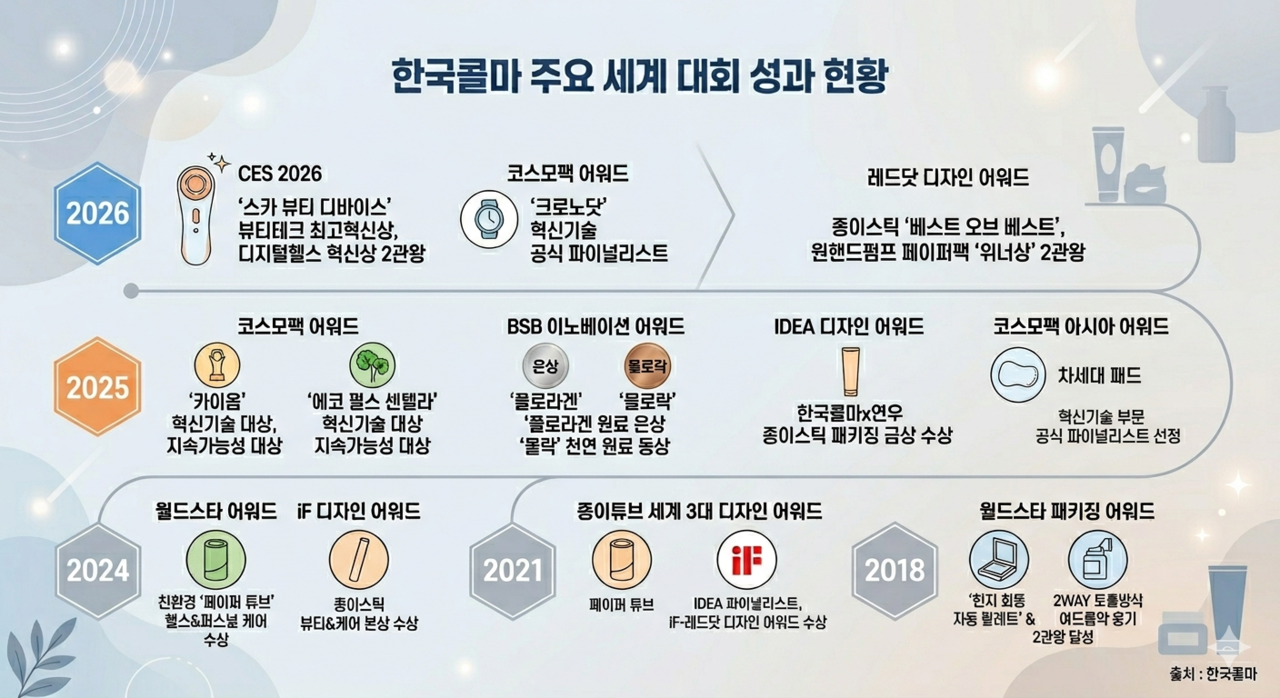 한국콜마는 지난 26일부터 28일까지 이탈리아 볼로냐에서 열린 ‘코스모프로프 볼로냐 2026’의 코스모팩 어워드에서 혁신기술 부문 파이널리스트에 선정된 것으로 1일 알려졌다. 한국콜마는 지난해 같은 시상식에서 혁신기술과 지속가능성 2개 부문 대상을 받은 데 이어 올해도 2년 연속 최종후보에 이름을 올리며 기술 경쟁력을 재확인했다.
