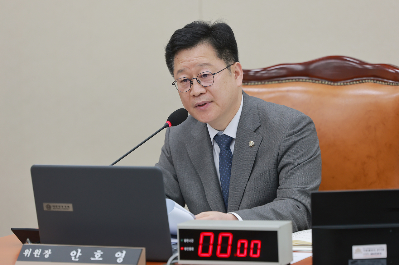 | 2일 국회에서 열린 기후에너지환경노동위원회 전체회의에서 위원장인 안호영 더불어민주당 의원이 사임 인사를 하고 있다. [연합] |
