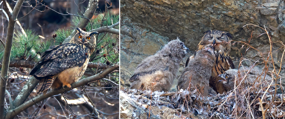 [헤럴드경제(울산)=박동순 기자] 천연기념물이자 멸종위기 야생생물 Ⅱ급인 수리부엉이가 새끼 4마리를 성공적으로 길러내는 장면이 울산시 울주군 절개지 암벽에서 포착됐다. 수리부엉이는 일반적으로 한 번에 2~3마리의 새끼를 낳는데, 이번처럼 4마리 모두 번식에 성공한 사례는 드물다.