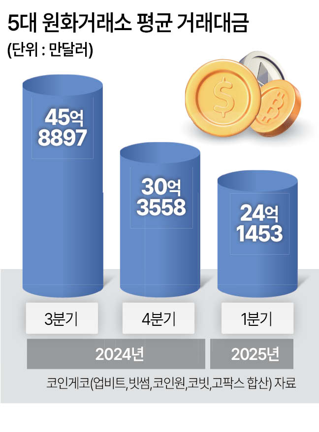 국내 5대 디지털자산 거래소 일평균 거래대금이 최근 6개월새 6조원에서 3조원 수준으로 절반 가량 줄어든 것으로 나타났다. 두 분기 연속 거래대금이 줄며 유동성이 메마른 가운데 시장에 활력을 불어넣을 법인 투자 및 업권법 제정도 지체되고 있다.