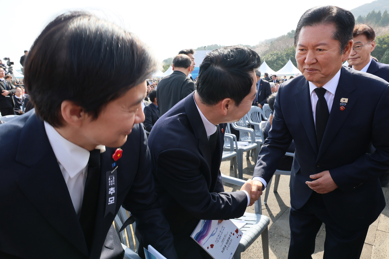 | 정청래(오른쪽부터) 더불어민주당 대표와 장동혁 국민의힘 대표가 3일 제주 4·3 평화공원에서 열린 제78주년 제주 4·3 희생자 추념식에서 인사를 나누고 있다. 왼편은 조국 조국혁신당 대표 [연합] |