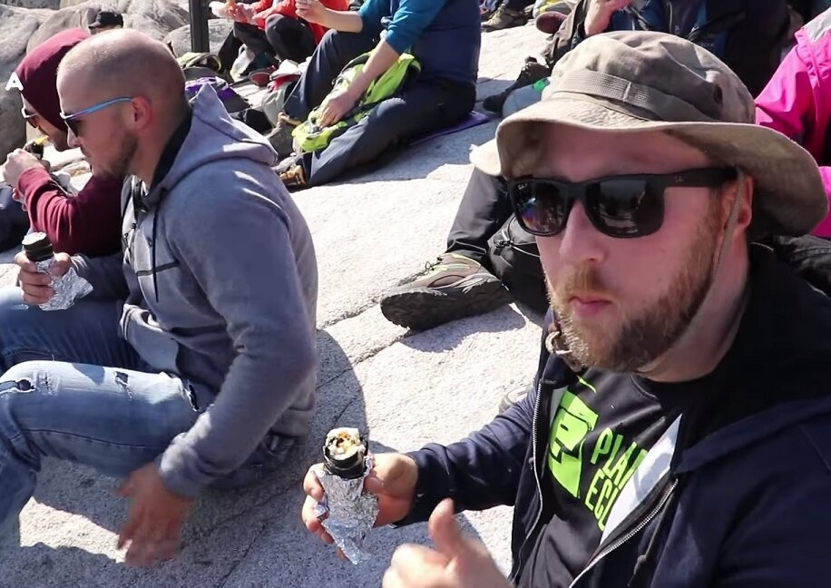 | 북한산 등정후 휴식시간에 김밥을 먹고 있는 외국인 |