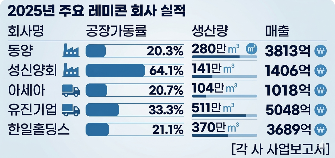 다른 업체들도 사정은 크게 다르지 않았다. 동양의 지난해 레미콘 공장 가동률은 20.3%였다. 연간 생산량은 280만㎥, 부문 매출액은 3813억원이었다. 한일홀딩스는 가동률이 21.1%까지 떨어졌다. 연간 생산량은 370만㎥, 부문 매출액은 3774억원으로 집계됐다. 삼표는 상황이 더 심각했다. 지난해 공장 가동률은 17.0%에 그쳤고 연간 생산량은 47만㎥, 부문 매출액은 473억원 수준에 머물렀다. 성신양회는 64.1%로 상대적으로 높았지만, 생산량은 141만㎥, 부문 매출액은 1406억원이었다.
