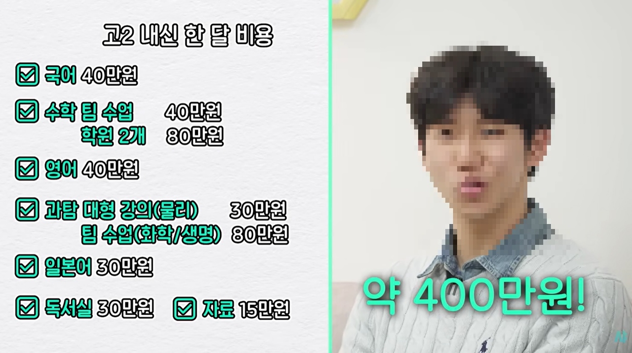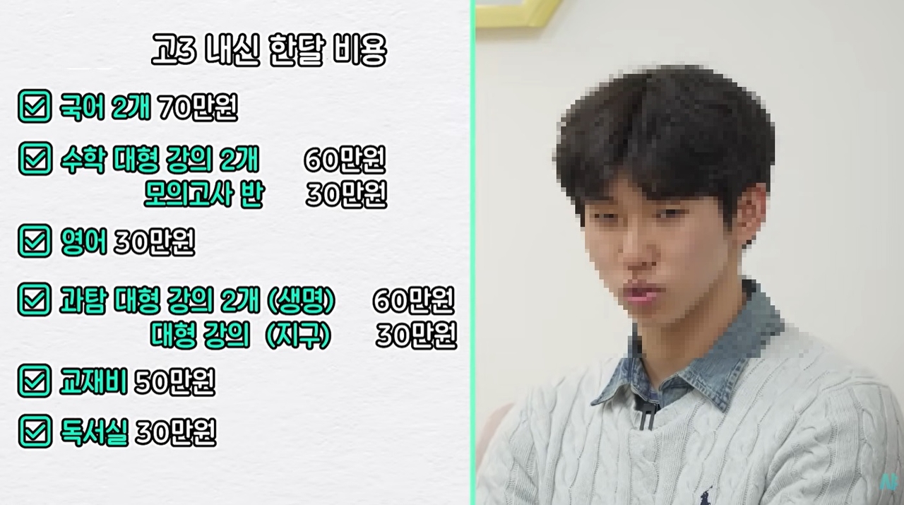 재수를 했다는 그는 “전액 장학금을 받고 재수를 시작했는데도, 교재비, 독서실비, 식비는 따로 들었다. 그것만 2000만원이었다”며 “친구들은 1년에 5000만~6000만 원 정도 드는 것 같더라”고 했다.