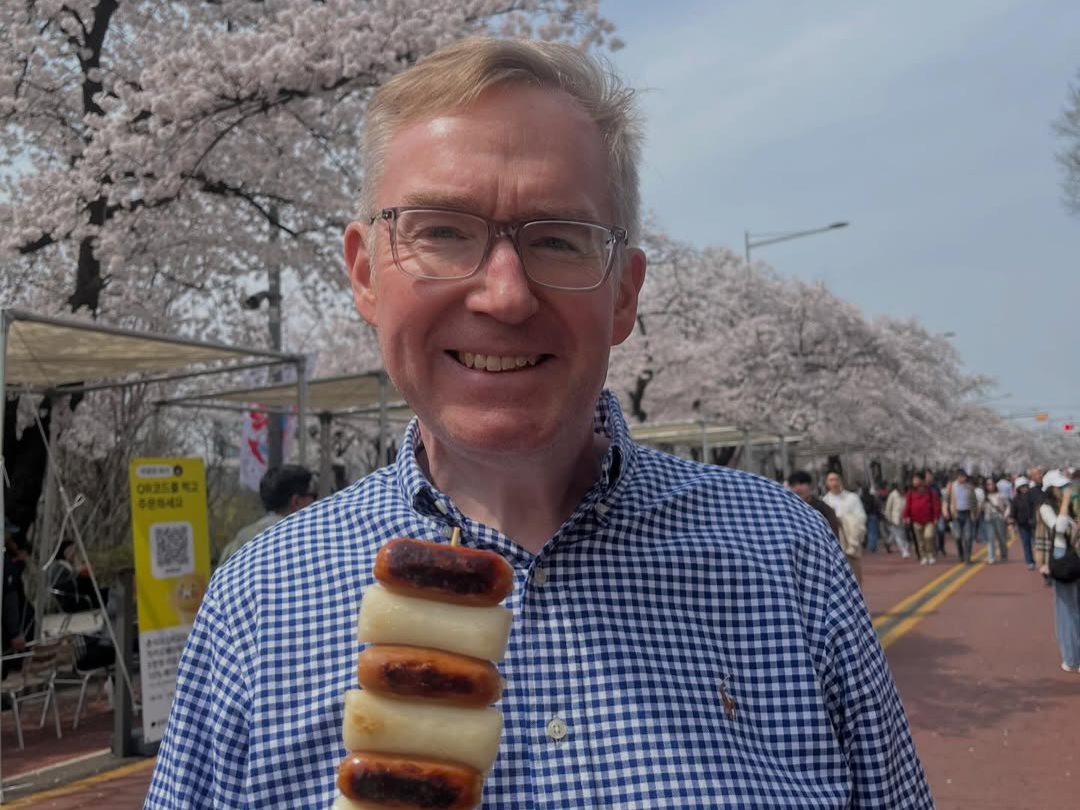 여의도 국회의사당 인근 윤중로 벚꽃길을 걸은 크룩스 대사는 소세지와 떡을 꼬치로 만든 ‘소떡소떡’을 구매해 손에 들고 인증샷을 남기기도 했다.