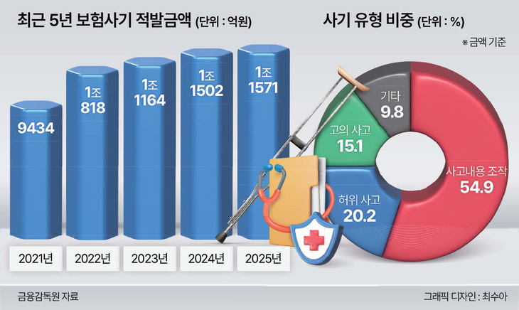AI 활용 보험사기에 대한 우려가 갈수록 커지는 가운데 이미 보험사기는 매해 1조원이 넘는 피해가 발생하고 있다. 금융감독원이 발표한 ‘2025년 보험사기 적발현황’을 보면 지난해 적발 금액은 1조1571억원을 기록했다. 사상 최대 금액인 것은 물론, 4년 연속 1조원대를 웃돌았다. 게다가 건당 사기 규모가 더욱 커지는 ‘고액화’ 추세도 뚜렷해지고 있다.