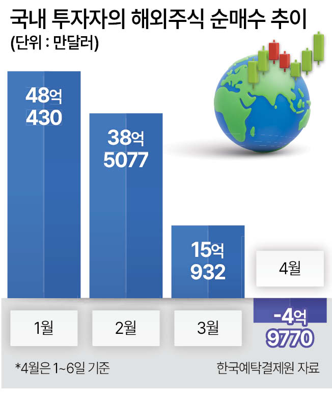 특히 해외 투자 비중 중 80%를 차지할 만큼 국내 투자자의 비중이 큰 미국 주식도 이달 들어 순매도로 전환했다. 1월 50억298만달러, 2월 39억4905만달러, 3월 16억9150만달러로 순매수 규모는 점차 감소했고, 4월에는 1~6일 기준 4억6357만달러 순매도를 기록했다.