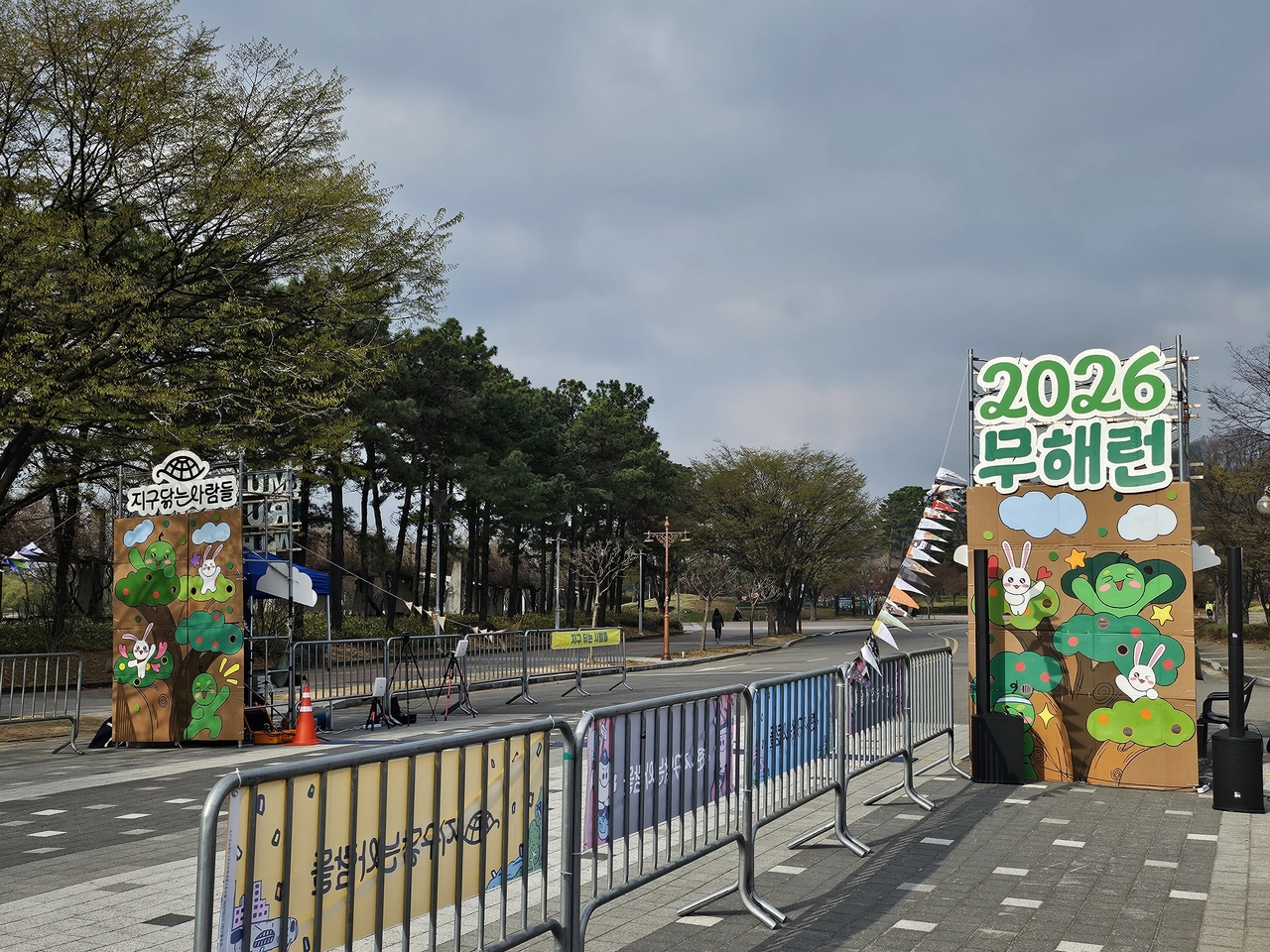 | 5일 오전 서울 마포 월드컵공원 평화광장에서 열린 ‘2026 무해런’ 출발 지점이 종이박스로 장식돼 있다. 김광우 기자. |