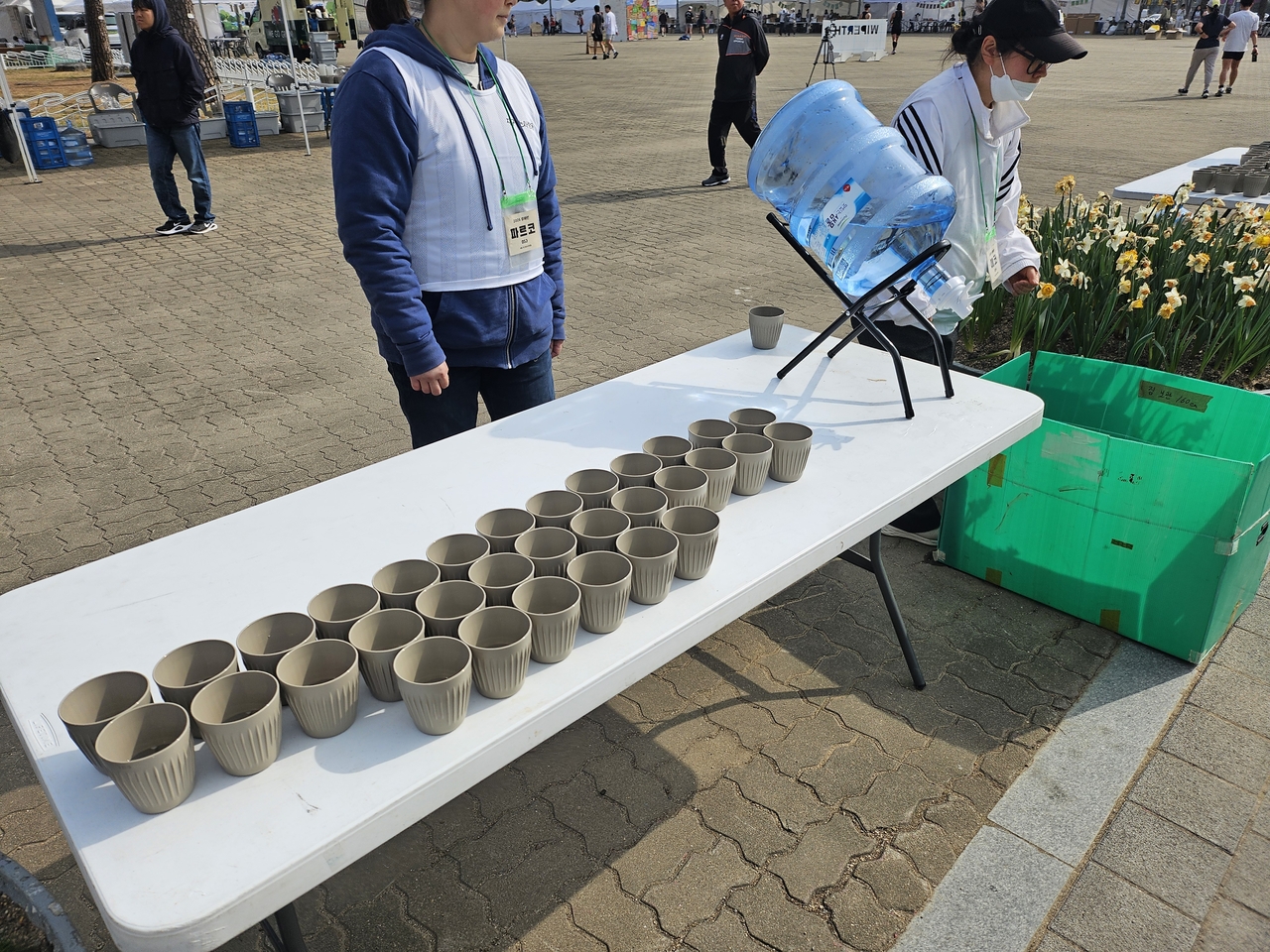 | 5일 오전 서울 마포 월드컵공원 평화광장에서 열린 ‘2026 무해런’ 급수대에 다회용컵이 놓여 있다. 김광우 기자. |