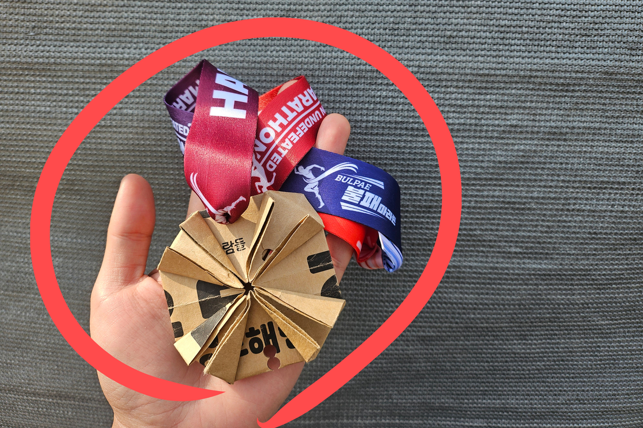 완주 이후에는 더 많은 특이점을 살펴볼 수 있었다. 우선, 바로 제공되는 메달이 없었다. 대신 완주자들은 자신의 배번표를 활용해, 직접 메달을 제작했다. 그리고 재사용 메달 끈을 매달아, 세상에 하나뿐인 특별한 메달을 완성했다.