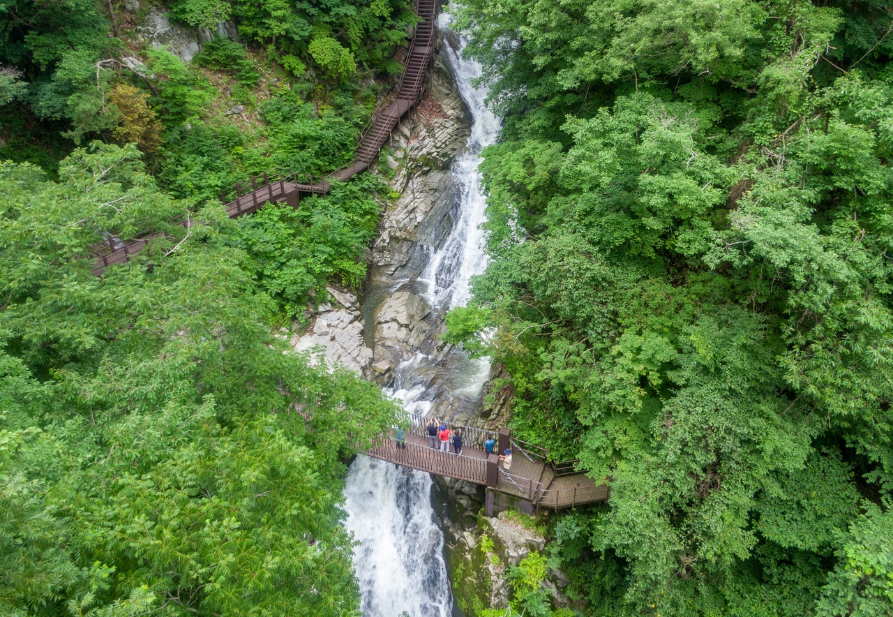 이면도로변에서 계단 370개를 내려가면, 구름다리 앞에 높이 30m의 폭포가 우렁차게 물줄기를 뿜어낸다. 겨우내 움츠렸던 심신이 활기를 되찾듯, 구룡도 새봄을 맞아 불어난 봄물을 대차게 쏟아내고 있었다.