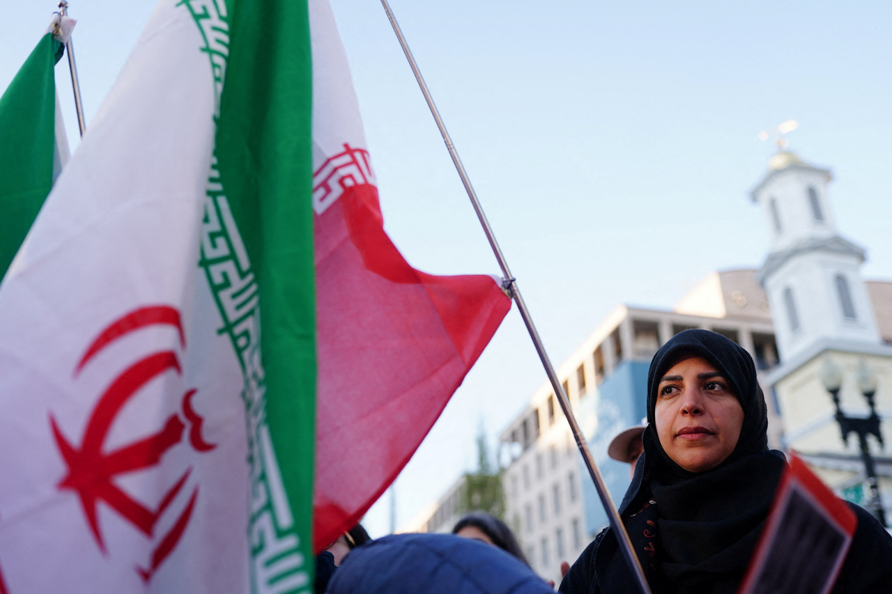 | 이란에 대한 미국의 공격을 반대하는 시위자가 7일(현지시간) 백악관 앞에서 이란 깃발을 들고 시위하고 있다. [로이터] |