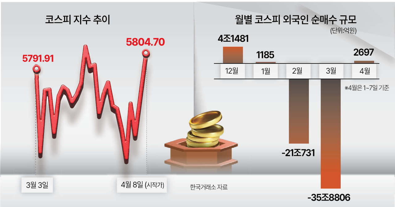 지난 2월과 3월에만 유가증권시장에서 약 37조원 순매도를 기록했던 외국인은 이달 들어 서서히 반등 기류가 읽힌다. 지난 3일(8035억원)과 7일(3704억원) 순매수를 기록한 데 이어, 이날엔 1조원대까지 순매수세를 확대했다.