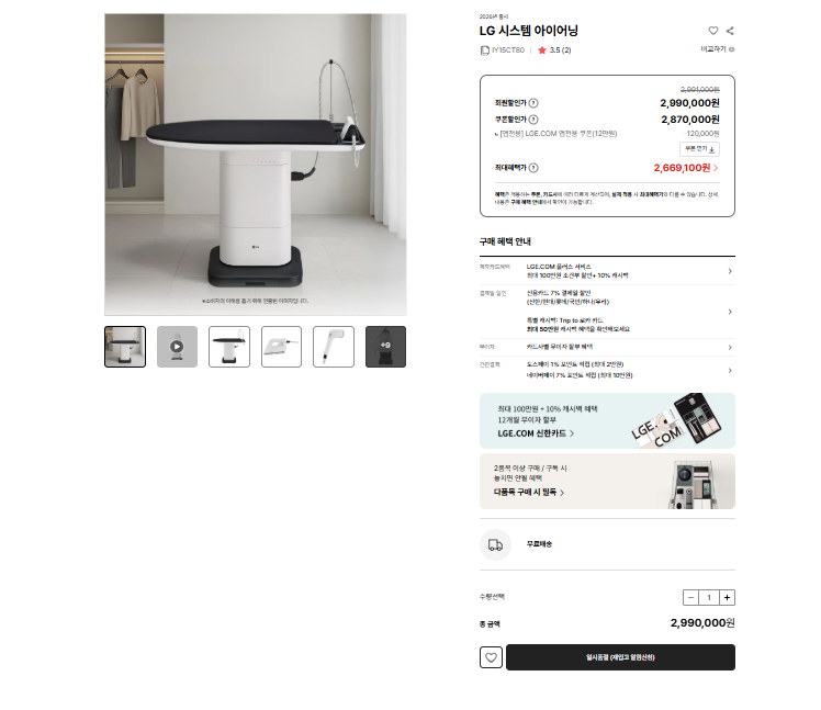 | LG전자의 올인원 의류관리 설루션 ‘LG 시스템 아이어닝’이 제품 출시 한 달 만에 품절됐다. [LG전자베스트샵 캡처] |