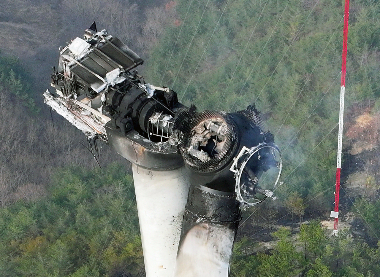 | 지난달 23일 경북 영덕군 한 풍력발전기(19호기)에서 불이 나면서 당시 80m 높이 발전기에 올라 보수 작업을 하던 작업자 3명이 숨졌다. [연합] |