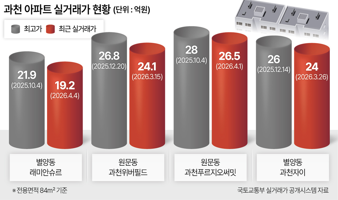 원문동에 소재한 과천위버필드의 경우에도 같은 타입이 지난해 12월 26억8000만원에 신고가를 경신했지만, 지난 3월 15일 가격이 24억1000만원까지 떨어졌다. 인근 과천푸르지오써밋 84㎡ 역시 지난해 10월 28억원 최고가를 찍었지만 지난 1월 26억5000만원에 거래돼 1억5000만원의 하락폭을 기록했다.
