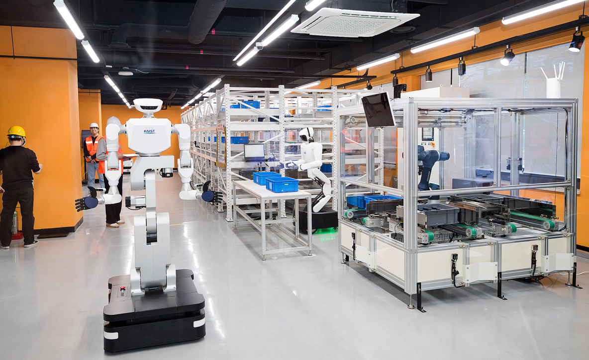 | 울산시가 정부 지원을 받아 조선업 혁신을 위한 인공지능(AI) 기반 구축에 나선다. 사진은 한국과학기술원(KAIST)이 구현한 ‘피지컬 AI 실증랩’에서 로봇들이 AI 에이전트 ‘다비스’의 지휘에 따라 일하고 있는 모습. [과학기술정보통신부 제공] |