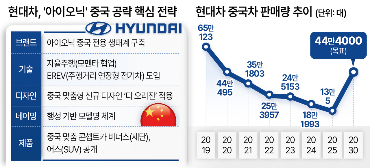 현대차는 ‘중국에서, 중국을 위해, 세계로’ 전략 아래 향후 5년간 20종의 신차를 투입하고, 2030년까지 중국 판매량을 약 44만대 수준으로 끌어올릴 계획이다. 이는 지난해 약 13만대 판매 대비 3배 이상 확대하는 수준이다.