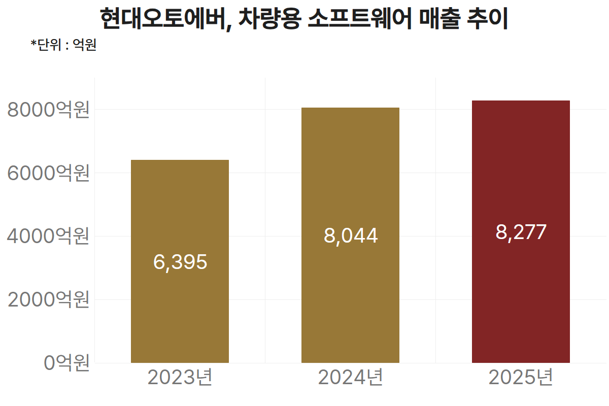 다만 최근 현대오토에버의 SW(소프트웨어) 부문 성장 속도는 다소 둔화된 모습이다. 차량 SW 매출 성장률은 2022년 72.9%, 2023년 27.9%, 2024년 25.8%로 고속 성장해왔으나, 지난해에는 매출 8277억원으로 전년 대비 2.9% 증가에 그쳤다. 미국 관세 영향과 유럽 시장 내 가격 경쟁 심화로 내비게이션 옵션 선택률이 하락한 것이 주된 원인으로 꼽힌다.
